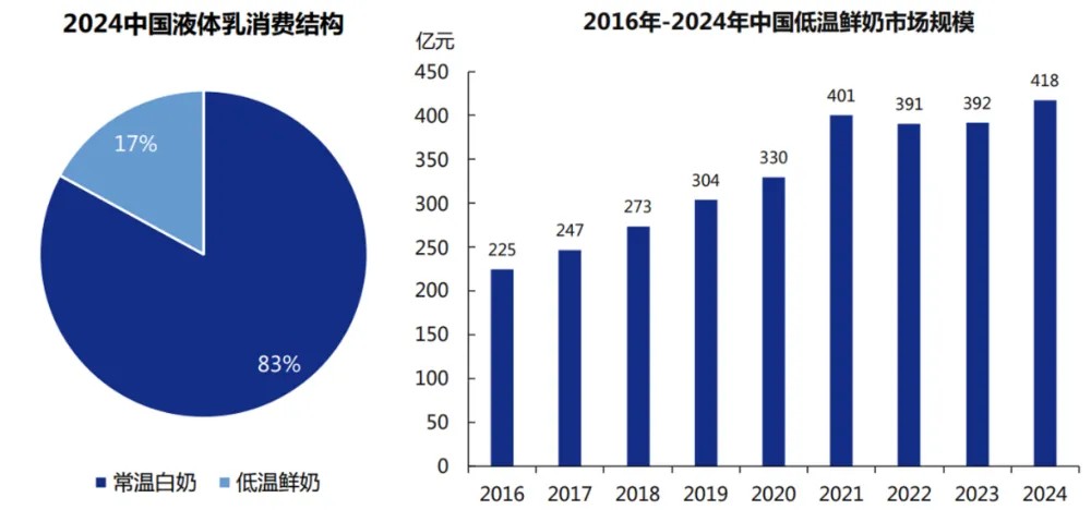 因此,能够较好保留活性营养、口感更新鲜的低温鲜奶愈发受到青睐。2024年,低温鲜奶市场规模增长至418亿元,2022-2027年复合年增长率预计可达12%,成为增速最快的细分赛道[2][3]。
