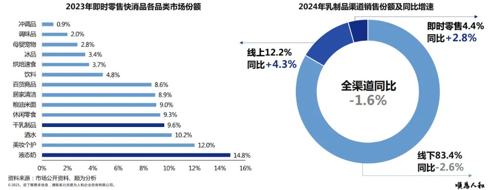 当前,即时零售正在向全品类拓展。2023年,液态奶在即时零售市场中贡献了14.8%的份额,占比最大,带动乳制品消费向线上转移。即时零售正在成为创造乳业新增量的重要战场。