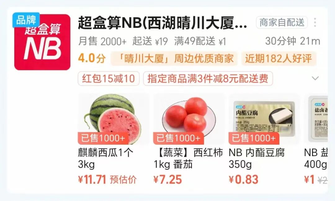 离阿里巴巴西溪园区仅4公里的超盒算NB晴川大厦店因为生意太过火爆,当天下午在我们尝试下单时,已显示“运力不足”。