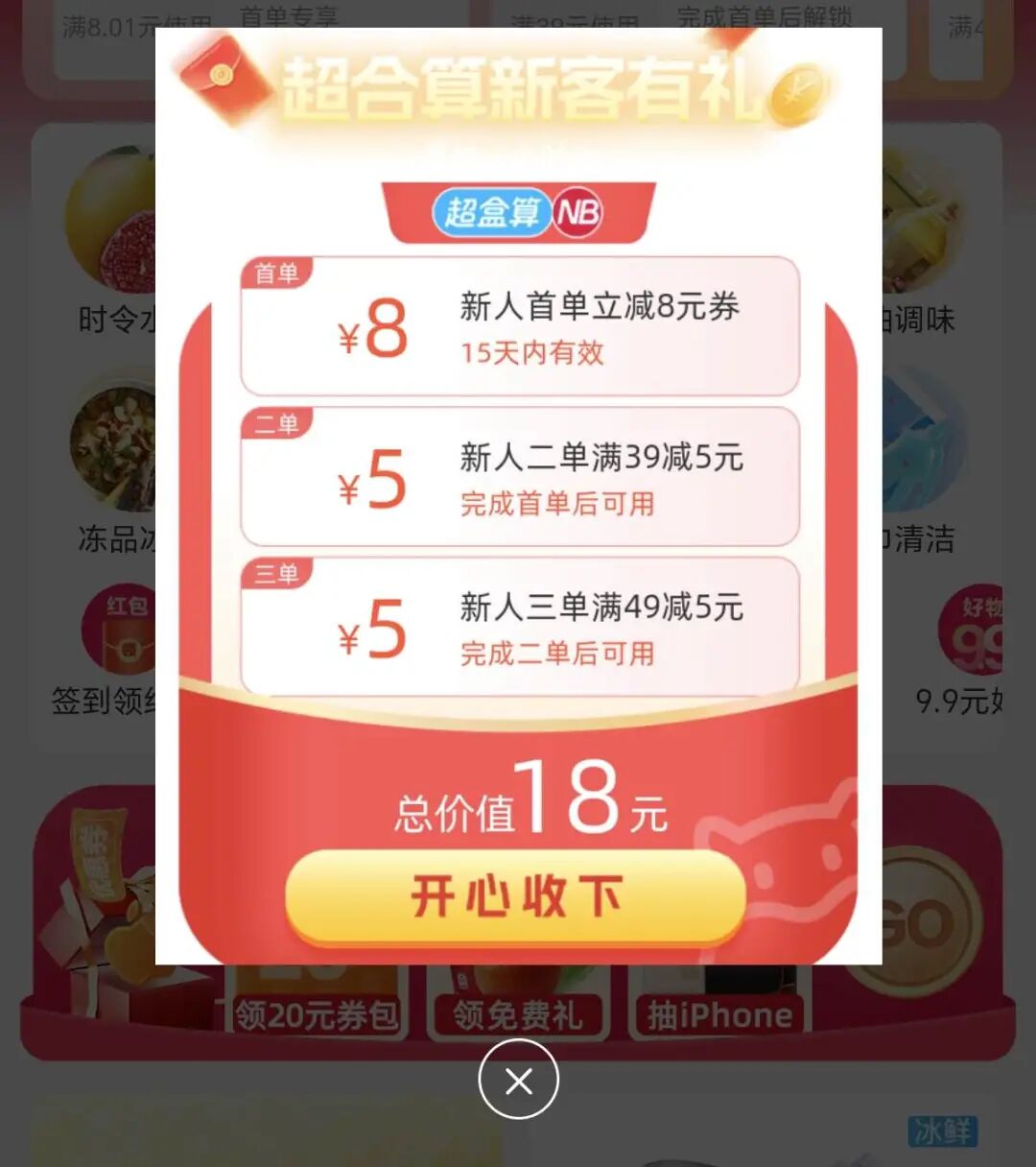 又例如超盒算微信小程序中,发券弹窗的标题叫“超合算新客有礼”。(此处不确定是bug还是谐音梗。)