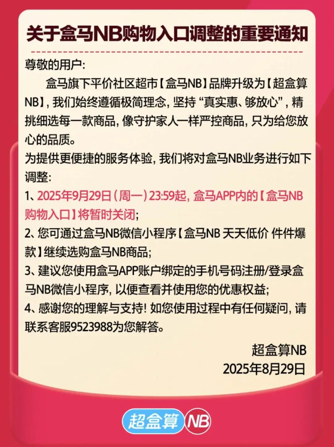 盒马APP则已发布公告,称9月29日起,盒马APP里的【盒马NB入口】将“暂时关闭”。