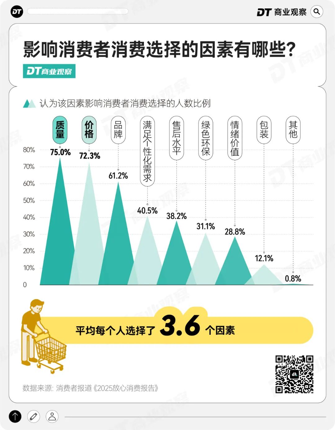 《消费者报道》发布的《2025放心消费报告》显示,在影响消费选择的因素中,质量(75.0%)和价格(72.3%)分列前两位。平均每个人选择了3.6个因素。