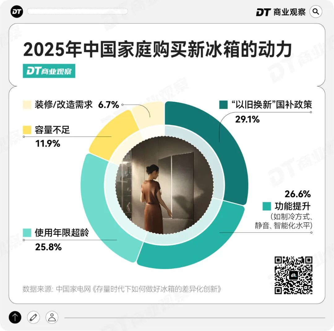 虽然真金白银的补贴,刺激了人们的消费意愿,但真到下单那一步,还是要看自己需不需要、综合价值到底怎么样。中国家电网消费调研数据显示,2025年消费者更换冰箱的最大动力,分别是国补“以旧换新”、功能提升、产品超年限和容量不足。
