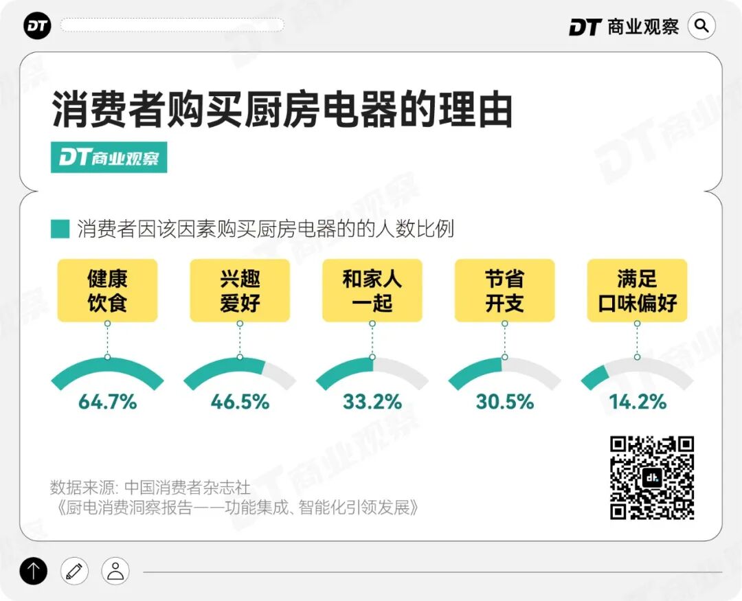 就以购买厨房电器为例,有64.7%的消费者因为“健康饮食”购买高品质的厨房电器,只有30.5%的消费者是因为节省开支而购买厨电。原因在于,厨电的使用场景和生活安全、健康生活息息相关,在这一品类上,健康可能是“第一需求”。