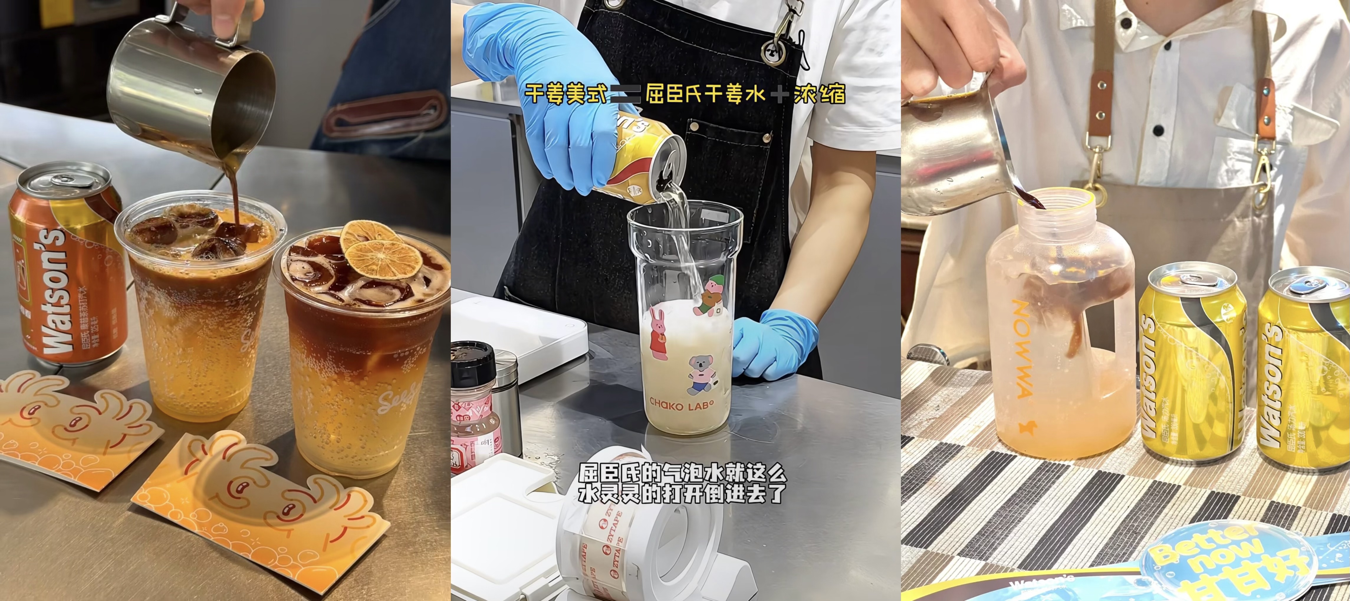 如屈臣氏苏打在和Seesaw、Manner、挪瓦咖啡等多家连锁咖啡品牌的联名中,分别以康普茶苏打汽水、干姜水和汤力水为基础,推出了“SOE康好姜来”、干姜美式,以及“汤力气泡苏爽美式”“桃桃气泡苏爽美式”等气泡咖饮,让人直观地感受到不同产品的风味特点以及调饮样本,由此提升用户认知,撬动C端的复购。