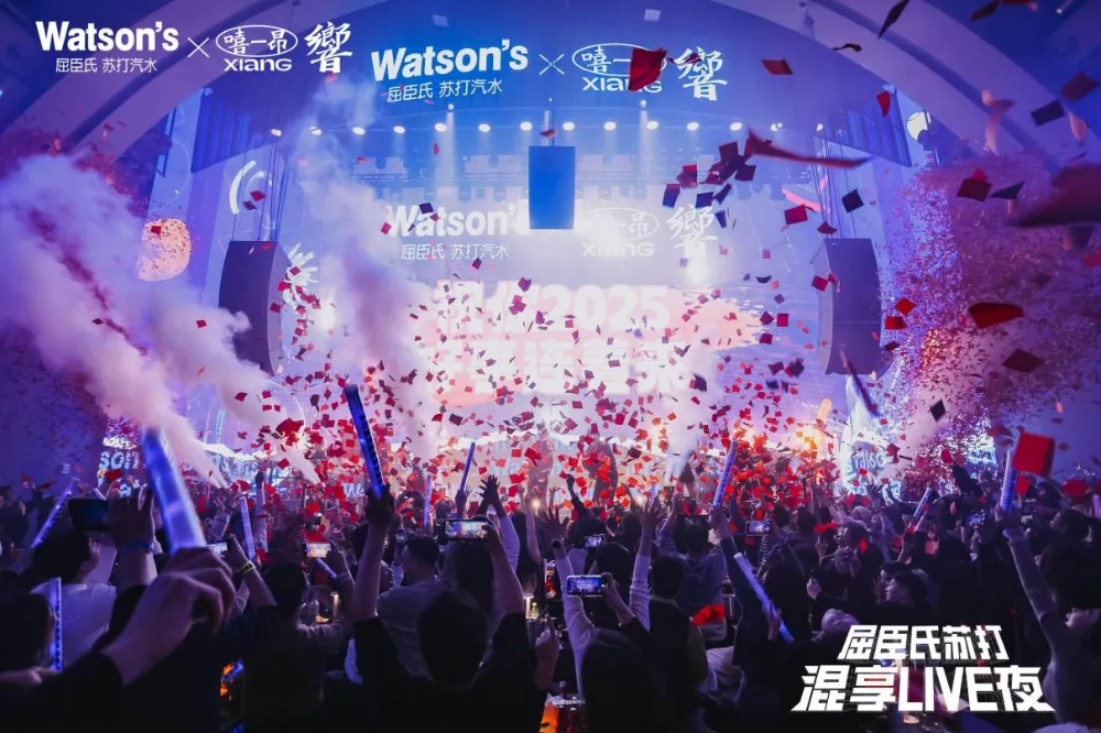 如2023年起,屈臣氏苏打就在全国多地顶尖夜店举办了近20场#屈臣氏苏打汽氛制躁局#,携手多位人气流行歌手空降派对现场,点燃派对氛围,提升曝光度的同时,还通过互动环节,让消费者在现场体验屈臣氏苏打与各类酒、果汁等的创意混饮方案,在嗨玩气氛中沉浸式种草。