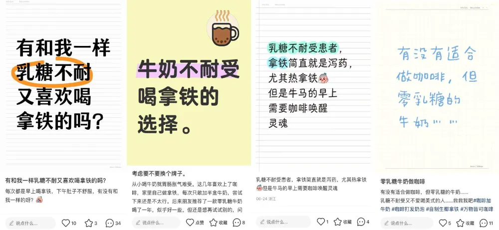 根据国金证券数据,目前消费者主要摄入的现磨咖啡品类中拿铁位居第一,占59%。与此同时小红书上"无乳糖拿铁"相关话题浏览量超1.2万,许多网友都在寻求更好的0乳糖选择。
