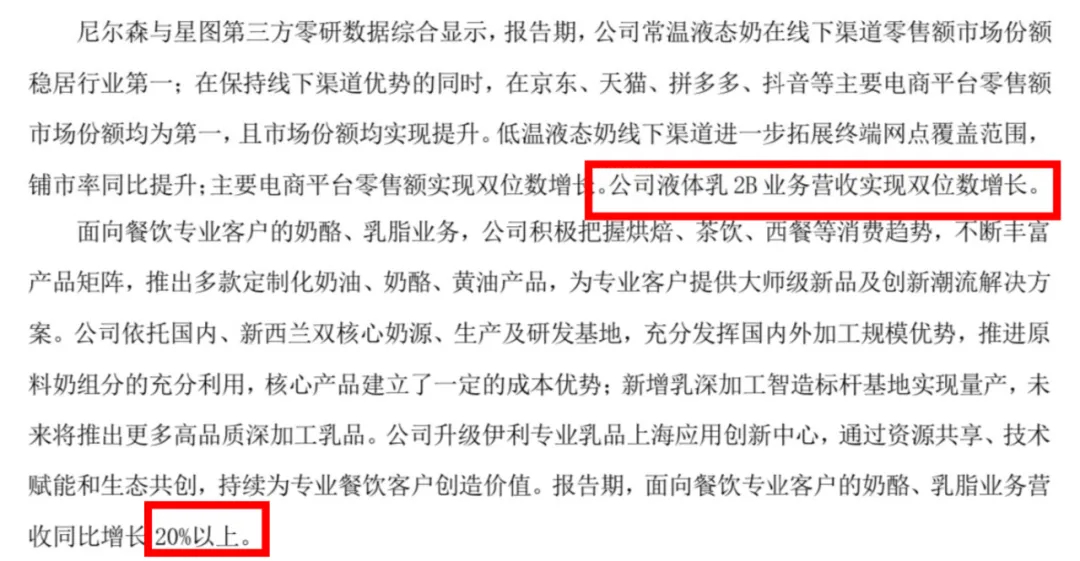 伊利2025年半年报数据显示,伊利B端业务营收占比增长20%以上。