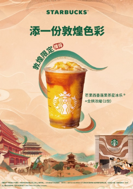 此外,敦煌主题店也将在十一期间限时推出敦煌限定客制化饮品,为假期增添一份敦煌色彩——在芒果西番莲果茶星冰乐中,注入的金烘浓缩咖啡缓缓流下,就像鸣沙山的沙坡,呼应了大漠黄昏的浓郁色调。从视觉上感受“入梦敦煌”,将文化共鸣延伸至味蕾,将敦煌的灿烂美景与咖啡香在此融合,与千年文明共舞,让人一杯入梦敦煌。