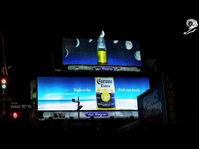 活动前期,科罗娜特邀麻省理工学院天体物理学系顶尖专家深度参与,通过精准测算月亮运行的椭圆轨迹,锁定纽约街头最佳观测点后,投放了两块上下堆叠的广告牌。下方版面呈现“白天”场景,上方版面对应“夜晚”场景,中间以科罗娜酒瓶形象串联。