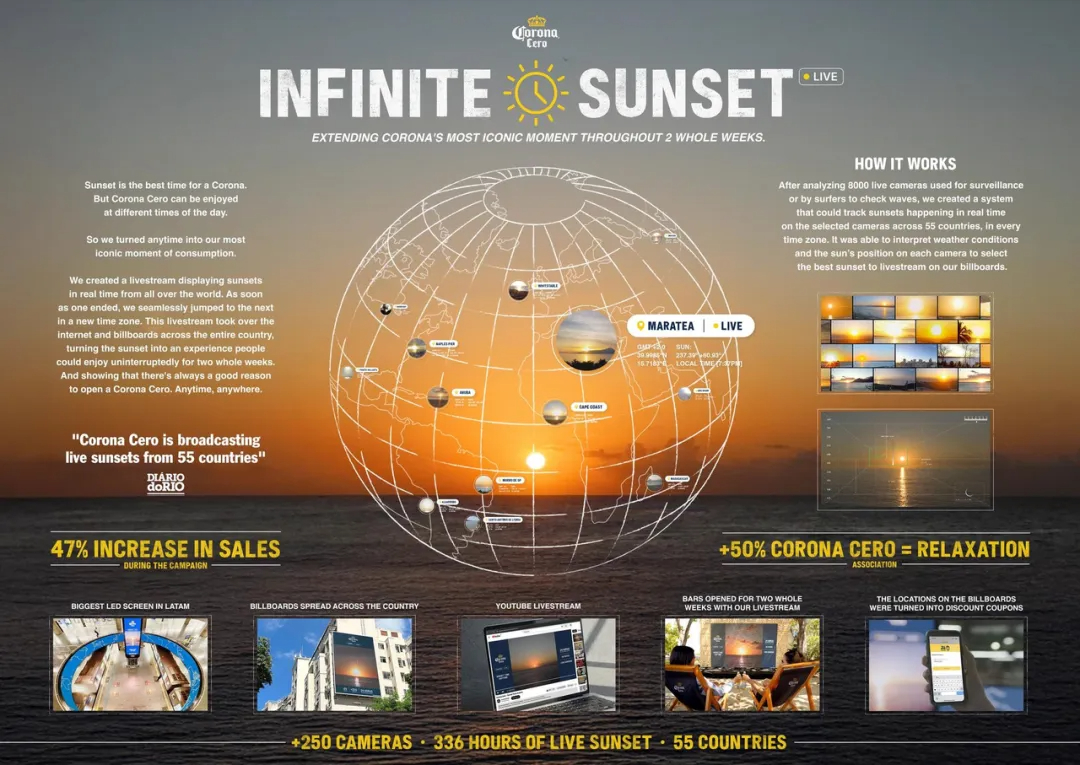 面对这一情感缺口,科罗娜在全球55个国家/地区,覆盖所有时区部署了超过250台摄像机,实现了连续不断的日落直播。