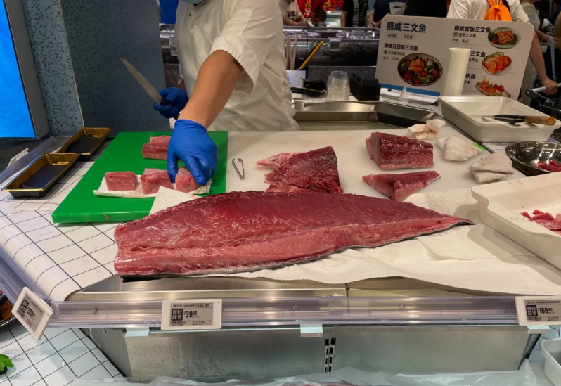 海鲜区师傅正在现场开鱼,一边把鱼肉切成整齐的厚片,一边给围观的人们介绍:“从挪威捕捞,再送到咱们这里,全程冷链,您看肌肉纤维的紧实度和脂肪层的分布,很新鲜。”盒马正是凭借全球直采、高效冷链、智能补货优势,重构了供应链体系,让消费者能第一时间触达全球优质食材,甚至实现“今日鲜,今日达”。