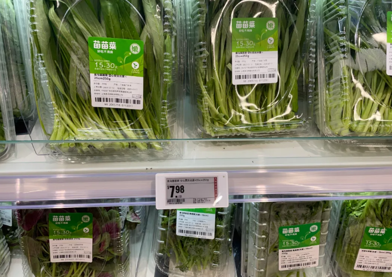 比如苗苗菜,包装上醒目标注着“好吃不用择”“嫩”“幼苗采摘,口感更鲜嫩”等卖点,并特别注明“苗苗菜生长周期约15-30天,普通叶菜生长周期约60天”。