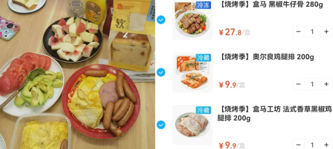 一位消费者之所以“转战”盒马,正是因为她看到了有机蔬菜里水灵灵的小番茄、400克装的牛排套餐、活蹦乱跳的生鲜,价格适中,分量刚好,新鲜看得见摸得着。
